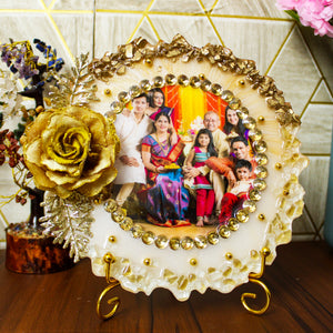 Introducing our Majestic Goldstone Customized Photo Frame, a luxurious addition to your home decor collection. This 8-inch frame, accompanied by a golden metal stand, exudes elegance and charm, making it a perfect centerpiece for any room.