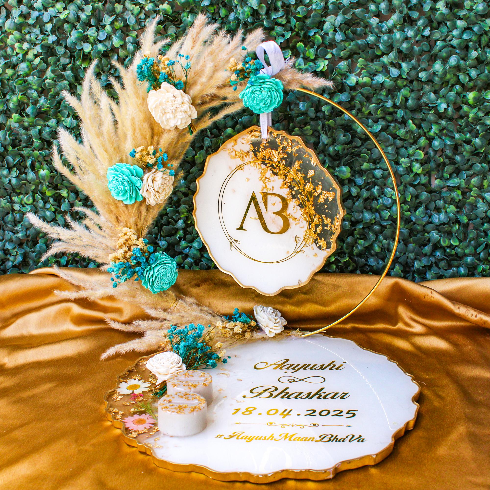 Rezica™ Royal Resin (Aqua n White Premium Themed) Engagement Ring Platter with 2 Premium Ring Boxes and Heavy Flower Hoop (10 Inch Base)