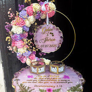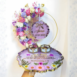 Rezica™ Royal Resin (Pink Lavender Fusion) Engagement Ring Platter with 2 Premium Ring Boxes and Heavy Flower Hoop (10 Inch Base)