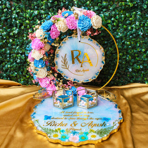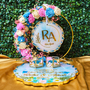 Rezica™ Royal Resin (Pink N Blue Royal Themed) Engagement Ring Platter with 2 Premium Ring Boxes and Heavy Flower Hoop (10 Inch Base)