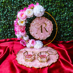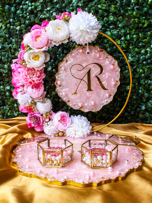 Rezica™ Royal Resin (Pink n White Themed) Wedding Engagement Ring Platter with 2 Premium Ring Boxes and Heavy Flower Hoop (10 Inches)