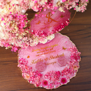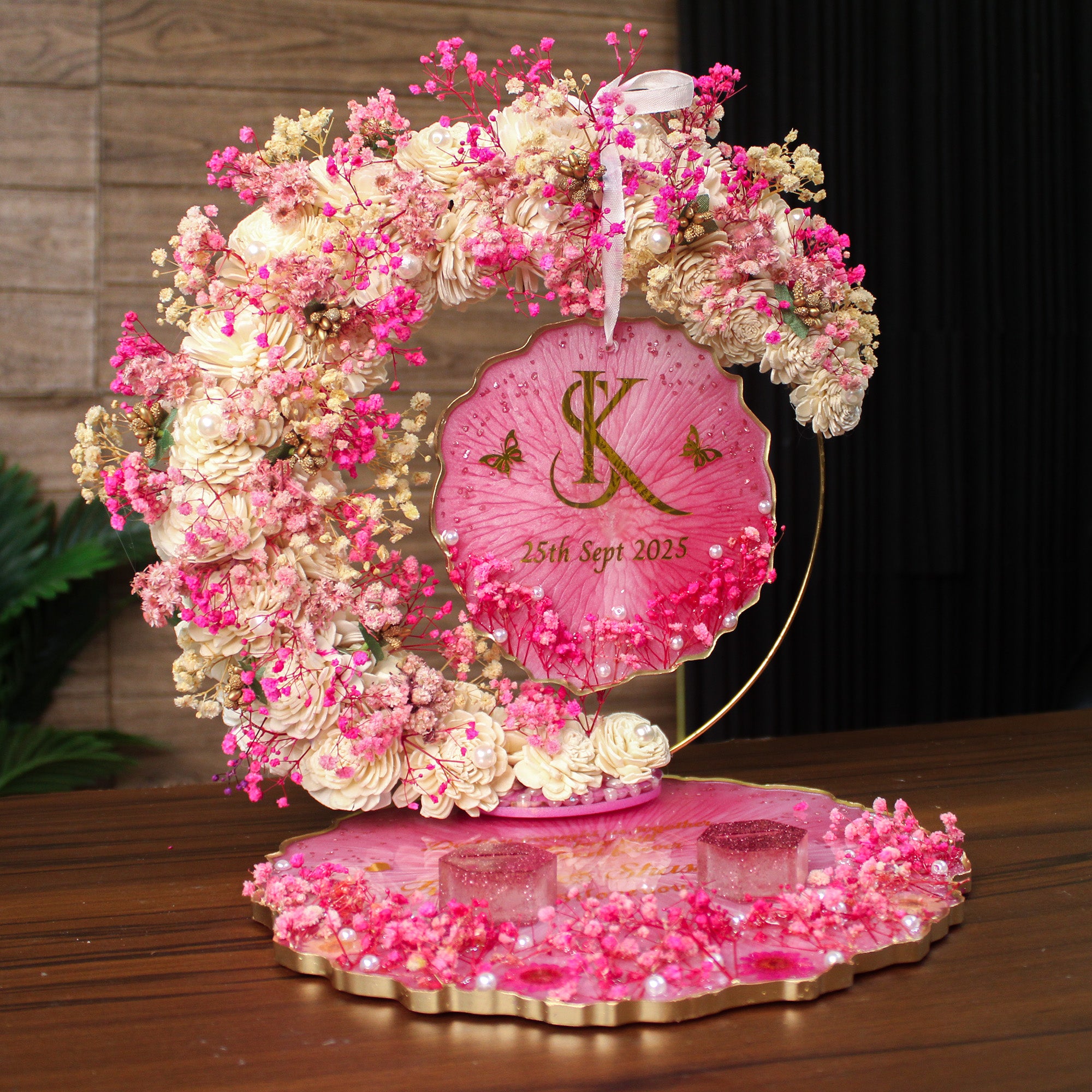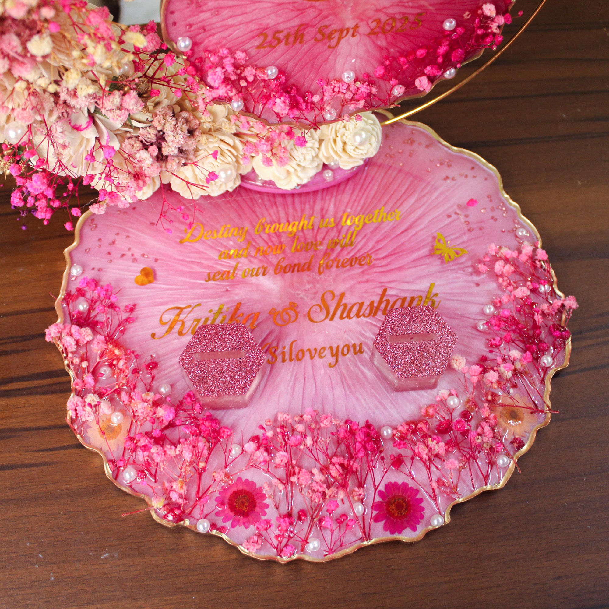 Rezica™ Royal Resin (Royal Pink Symphony) Engagement Ring Platter with 2 Premium Ring Boxes and Heavy Flower Hoop (10 Inch Base)