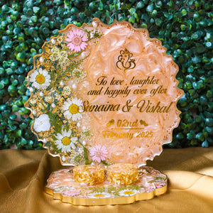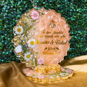Crafted with real dried flowers, this 10-inch resin platter is a perfect blend of elegance and functionality. It comes with two premium ring boxes, making it a stunning addition to your engagement or wedding ceremony.