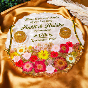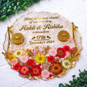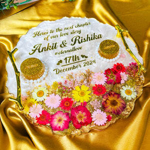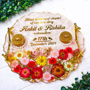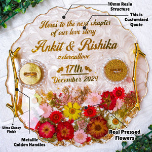 Crafted with real dried flowers, this 10-inch resin platter is a perfect blend of elegance and functionality. It comes with two premium ring boxes, making it a stunning addition to your engagement or wedding ceremony.