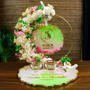 Rezica™ Royal Resin (White n Lime ) Engagement Ring Platter with 2 Premium Ring Boxes and Heavy Flower Hoop (10 Inch Base)